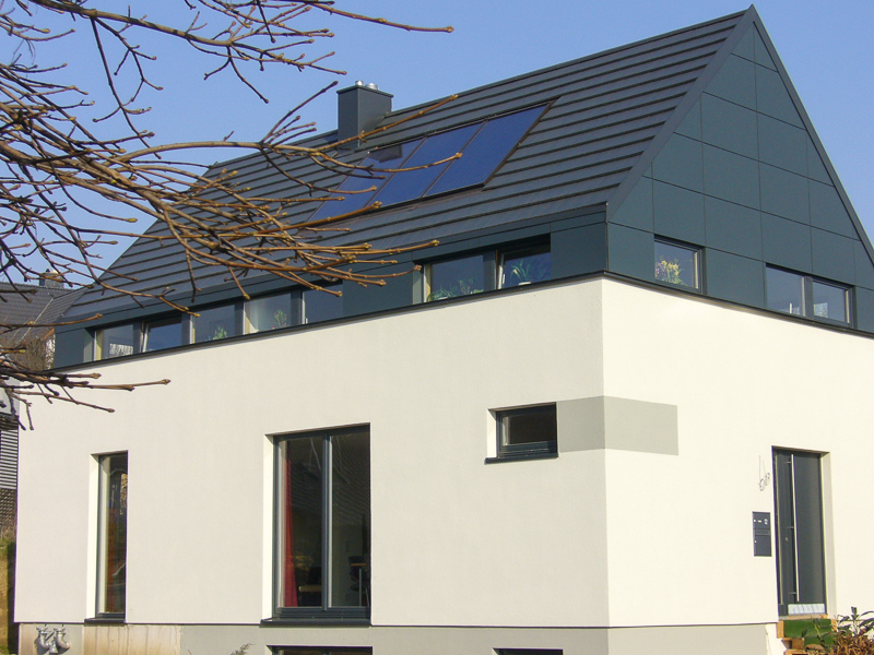 Der massive Erdgeschosskubus erhielt eine Wärmedämmfassade. Das in Holztafelbauweise errichtete zurück springende Dachgeschoss wurde mit Trespaplatten verkleidet. Der Rücksprung wird im Innenbereich als Einbauschrank genutzt.