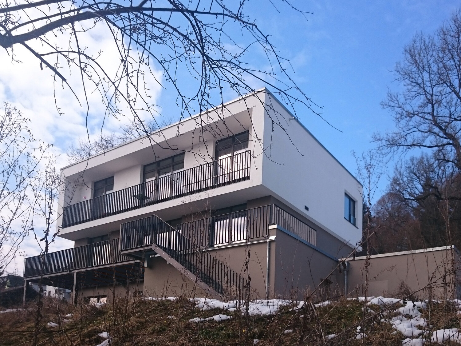 Auf dem 11.000qm großem Grundstück mit Teich wünschten sich die Bauherren ein dem Standort angepasstes modernes Wohnhaus, das sich nach Süden orientiert und sich in die Hangsituation harmonisch einfügt. Darüber hinaus sollte die Blickachse zum Schloss Bertholdsburg berücksichtigt werden. Entstanden ist ein zur Straße hin zwei- und zum Garten hin dreigeschossiges Gebäude mit einer großzügigen Verglasung zur südlich liegenden Gartenseite. Aus den dahinter liegenden Wohnräumen ist ein freier Blick über das weitläufige Grundstück in die freie Landschaft sowie zum Schloss möglich. Vom großzügigen Balkon im Erdgeschoss führt eine Außentreppe direkt in den Garten bzw. zum Teich.
